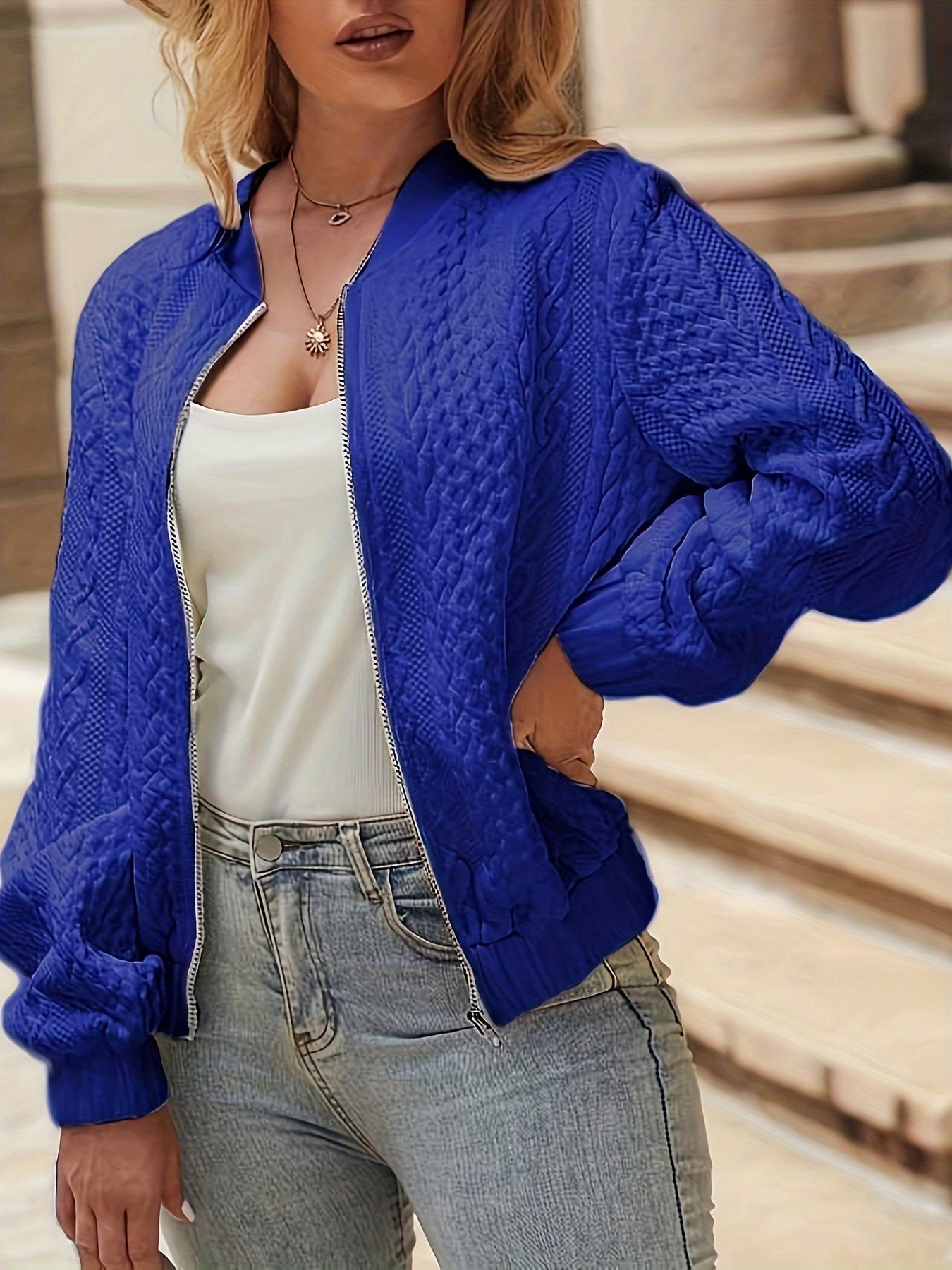 Gestrickte Bomberjacke Stilvolles Strukturiertes Zip-Up Damen