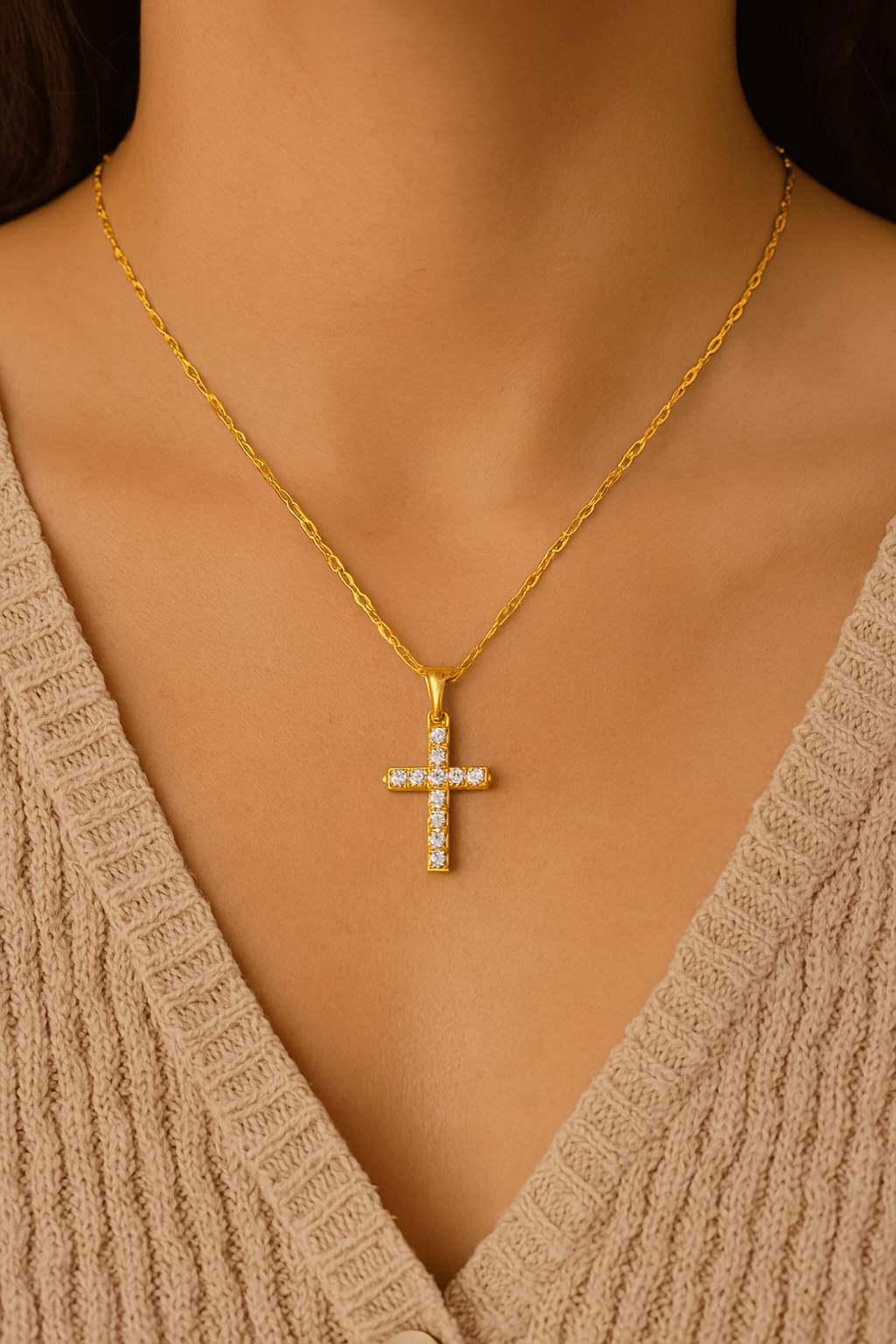 Die Zirkonia Kreuz Halskette verbindet die Langlebigkeit von Edelstahl mit dem Glanz von Zirkonia-Steinen. Ihr Kreuzanhänger, besetzt mit funkelnden Zirkonias, verleiht jedem Outfit einen Hauch von Raffinesse. Die goldene Beschichtung der Kette verstärkt ihre luxuriöse Ausstrahlung und macht sie zu einem bedeutungsvollen Accessoire für den Alltag oder besondere Anlässe.